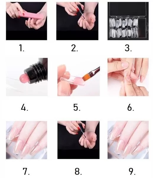 Εφαρμόστε ένα λεπτό στρώμα Poly Gel κάτω από ένα τεχνητό νύχι και στη συνέχεια κολλήστε το στο δικό σας νύχι. Αφού στεγνώσετε στη λάμπα UV/LED, αφαιρέστε το τεχνητό νύχι.