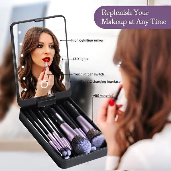 Το σετ πινέλων και ο καθρέφτης LED χωράνε τέλεια στην τσάντα σας, ώστε να μπορείτε να φρεσκάρετε το μακιγιάζ σας με ευκολία όπου κι αν σας πάει η μέρα σας.